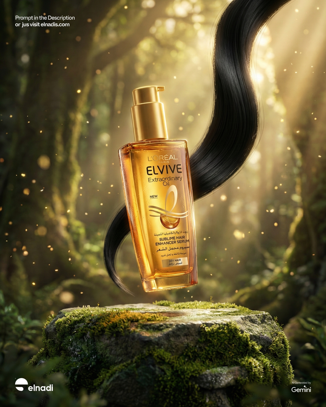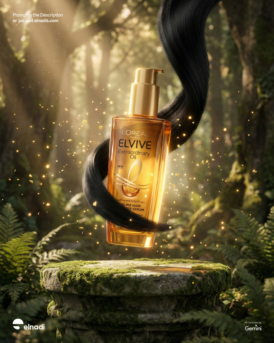 Premium Ayurvedic hair oil bottle floating slightly above a moss-covered stone in a mystical forest. Soft glowing particles and floating pollen surround the bottle. A smooth black hair strand flows upward like silk in slow motion. Golden hour backlight with volumetric rays, dreamy atmosphere, luxury branding aesthetic, cinematic product photography, ultra-realistic reflections, shallow depth of field, 8K, high-end beauty commercial style.