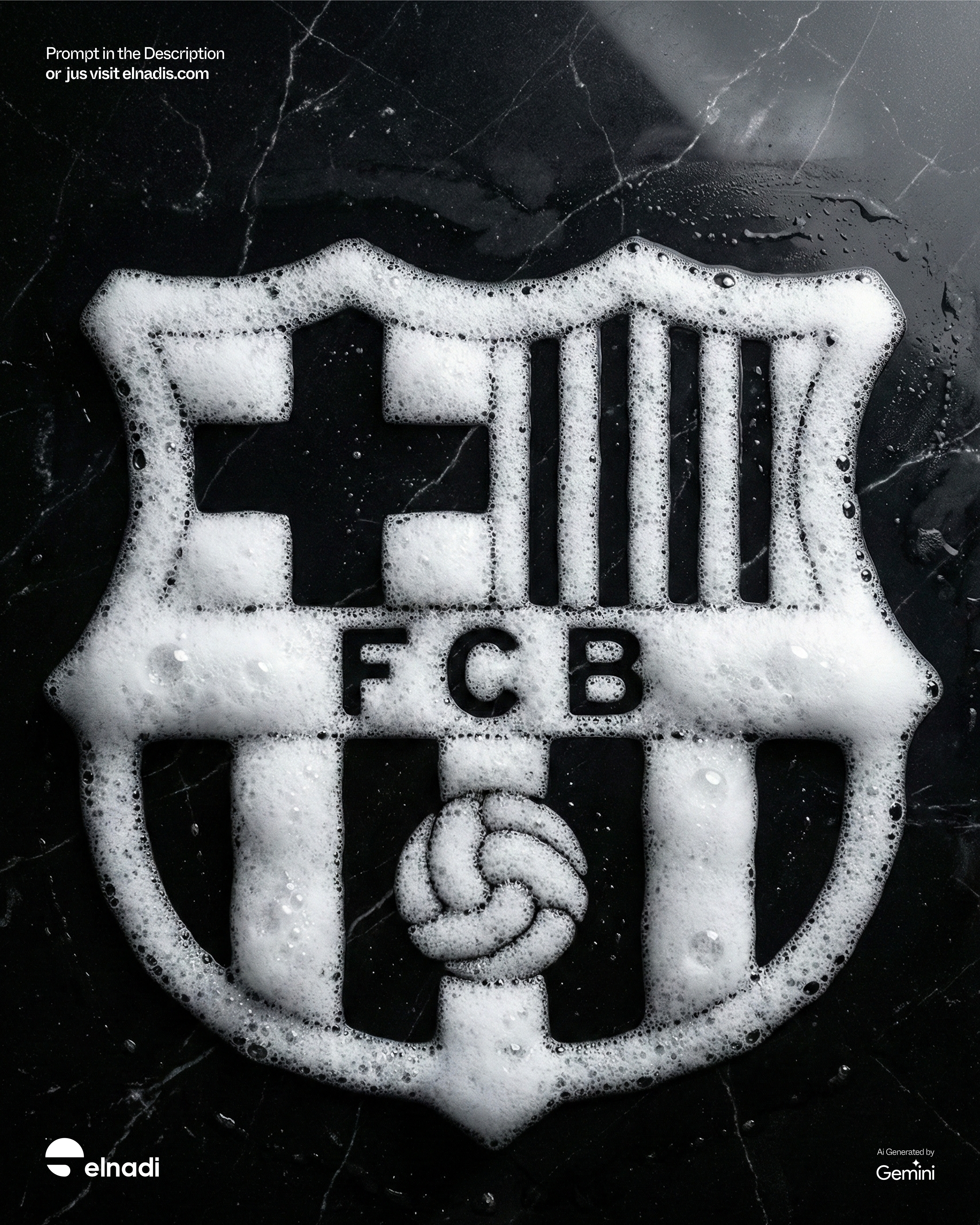 Ultra-realistic top-down photograph of detergent foam forming a precise [subject / logo / symbol / shape] on a polished black marble surface. Thick, airy white foam with realistic bubbles of varying sizes, natural translucency, wet shine, and soft highlights. Foam appears freshly formed, slightly uneven at the edges, physically accurate, volumetric, and naturally settled on the marble.