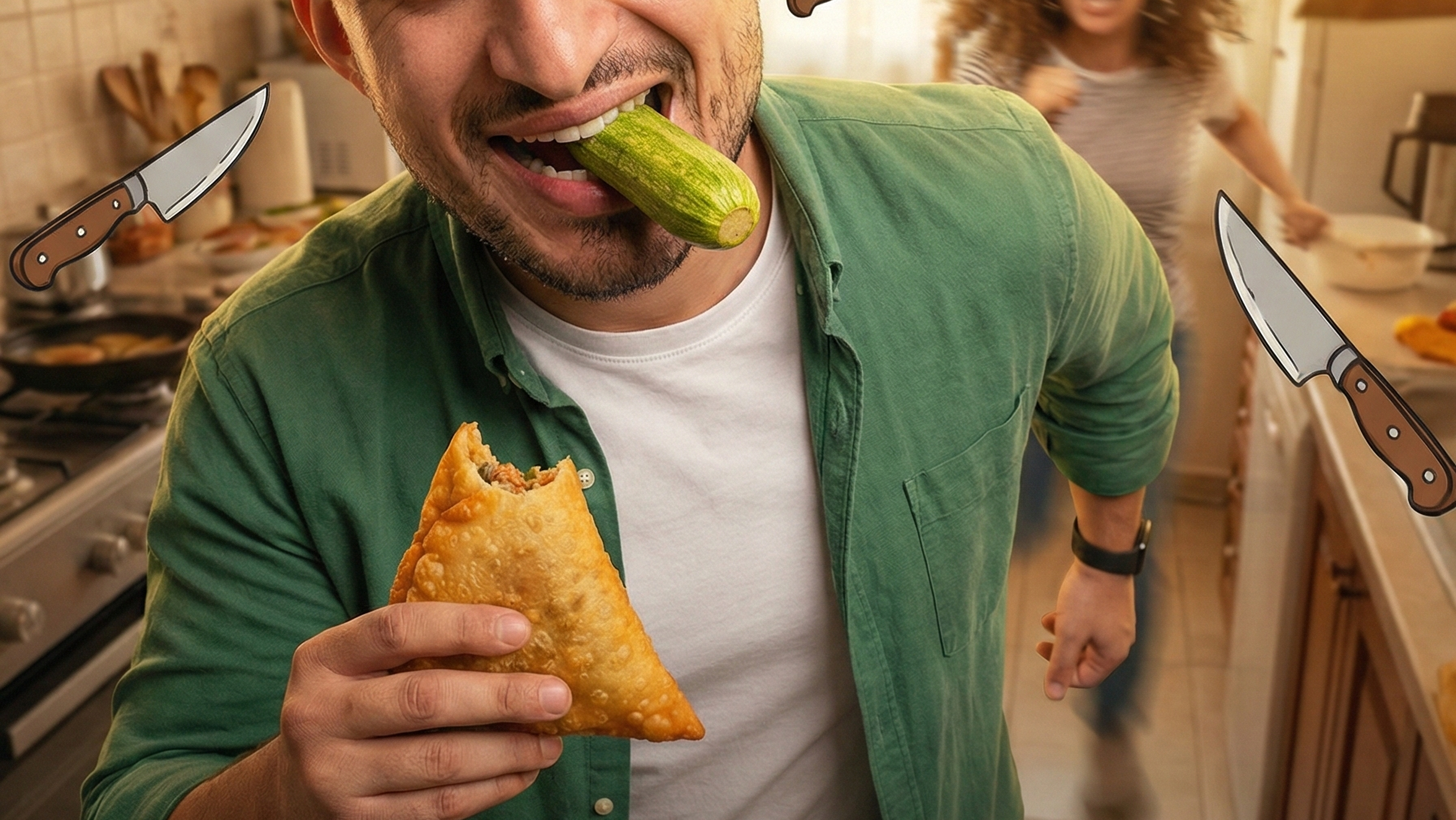 Facial expression: joyful and ridiculous — puffed cheeks, raised eyebrows, wide amused eyes, pure “finally iftar” happiness.