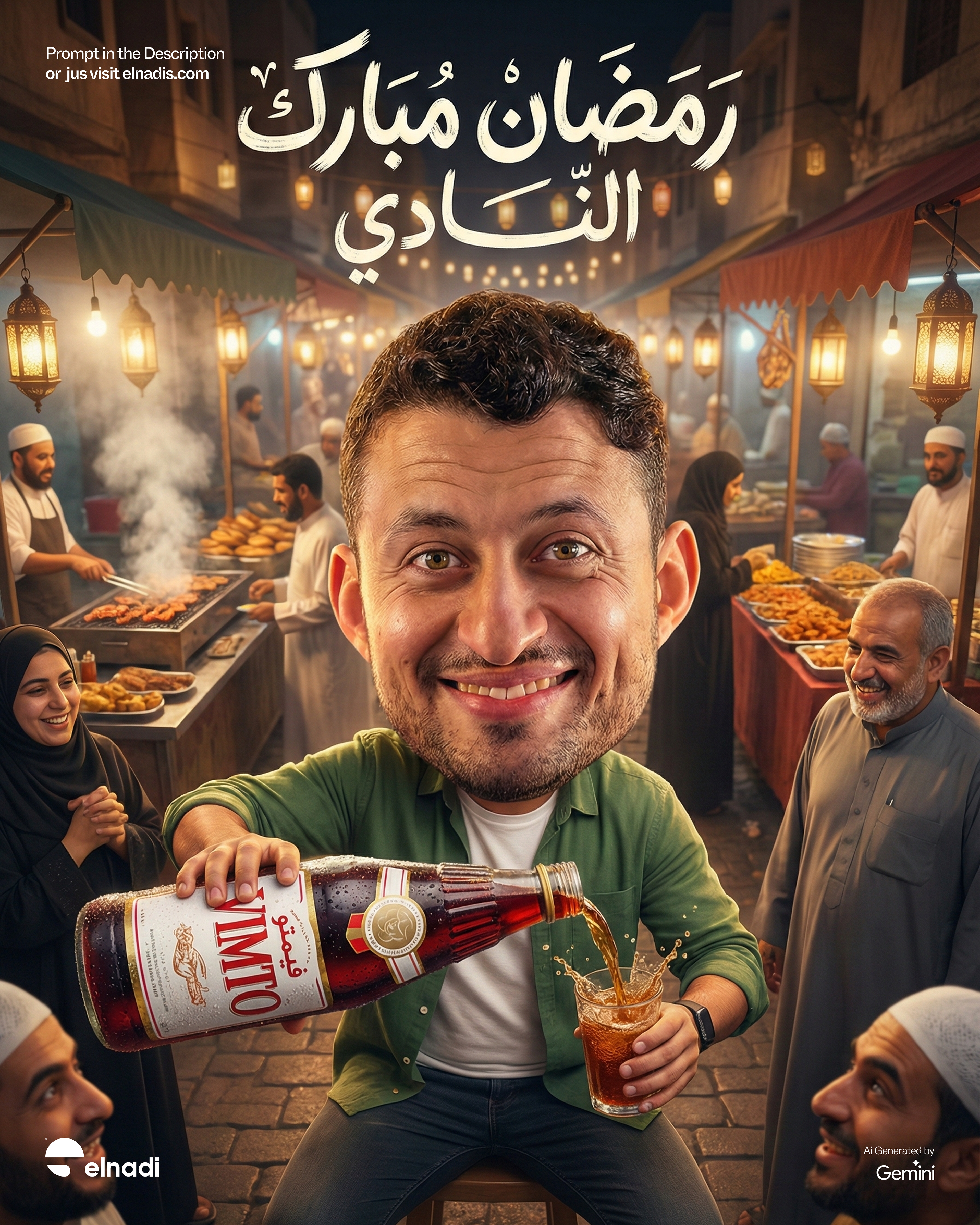 Lighting: warm cinematic Ramadan night lighting, golden stall lights, hanging bulbs, soft lantern reflections, controlled shadows enhancing skin texture and liquid gloss. Subtle motion blur in the environment only (face remains perfectly sharp).