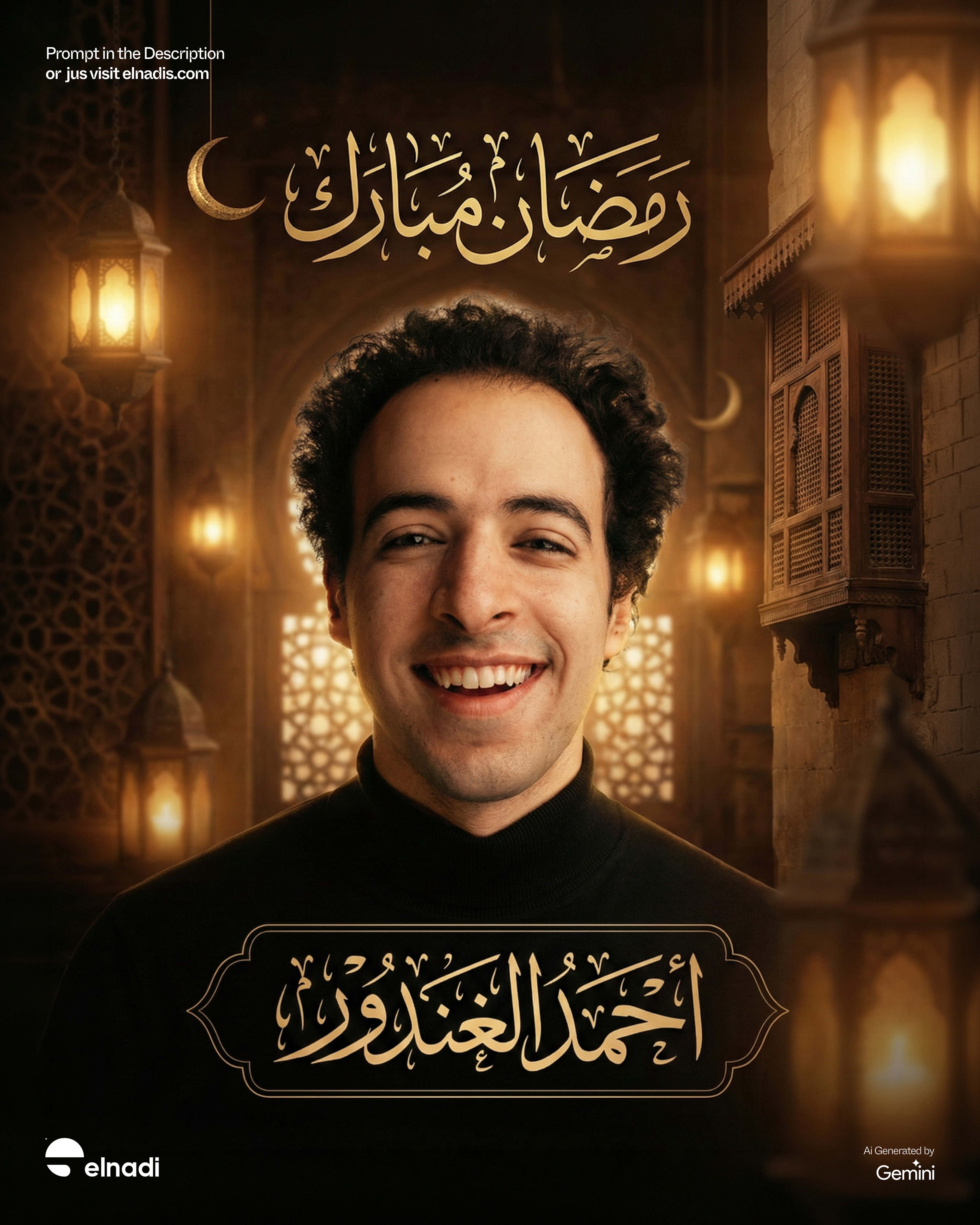 Use the reference image [ahmed] to create a luxurious cinematic Ramadan greeting card at the level of top-tier creative agencies. The design should automatically form in an innovative and highly professional style, featuring a dynamically generated elegant Arabic calligraphic phrase consisting of only one expression such as “Ramadan Mubarak.”