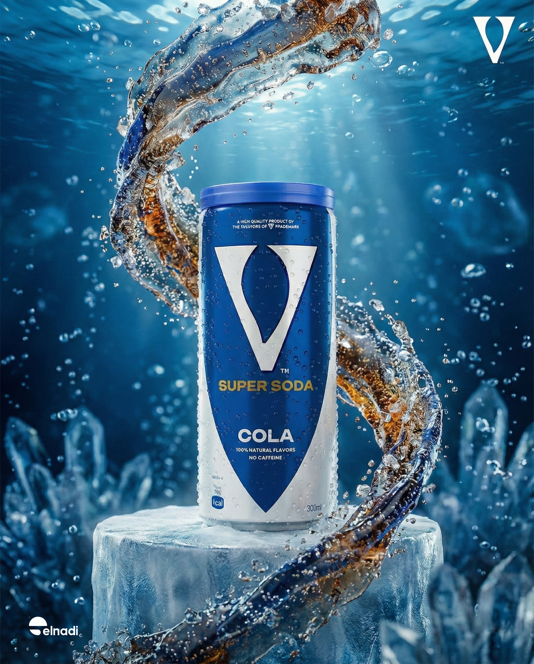 INSTRUCTION: Generate a high-energy, action-packed commercial product image with extreme realism and dynamic motion suitable for an explosive beverage advertisement; SUBJECT: A modern aluminum soda can branded "<BRAND_NAME> Cola", standard size, perfectly shaped, bold and confident design, metallic surface covered with intense condensation droplets, pristine and undamaged, strong logo presence with sharp typography; SETTING: Open ocean in an intense action moment, powerful waves crashing upward, dramatic water splashes exploding around the can, water frozen mid-air with visible droplets and motion trails, turbulent sea surface, distant horizon under a bright energetic sky; LIGHTING: Dramatic cinematic lighting with strong directional highlights, cool electric blue light bursting from beneath the water, high-contrast daylight from above, intense rim lighting outlining the can, glowing reflections on wet metal, sparkling highlights on flying droplets; STYLE: Hyperrealistic cinematic action concept art combined with high-speed commercial product photography, bold and energetic beverage advertising style; CAMERA & COMPOSITION: Slight low-angle perspective to enhance power and dominance, centered heroic framing, medium close-up shot, dynamic composition with diagonal wave motion, shallow depth of field, ultra-sharp focus on the can, frozen action moment; COLOR PALETTE: Vibrant electric blues, deep ocean navy tones, bright white highlights, high contrast, saturated and refreshing color treatment; TEXTURE & MATERIALS: Brushed aluminum, glossy printed label, thick condensation droplets, high-speed frozen water splashes, realistic liquid physics; MOOD & ATMOSPHERE: Powerful, energetic, refreshing, intense, bold, adrenaline-filled, modern; DETAIL LEVEL: Hyper-detailed, ultra-sharp, high-speed action clarity, cinematic commercial polish, physically accurate lighting and motion